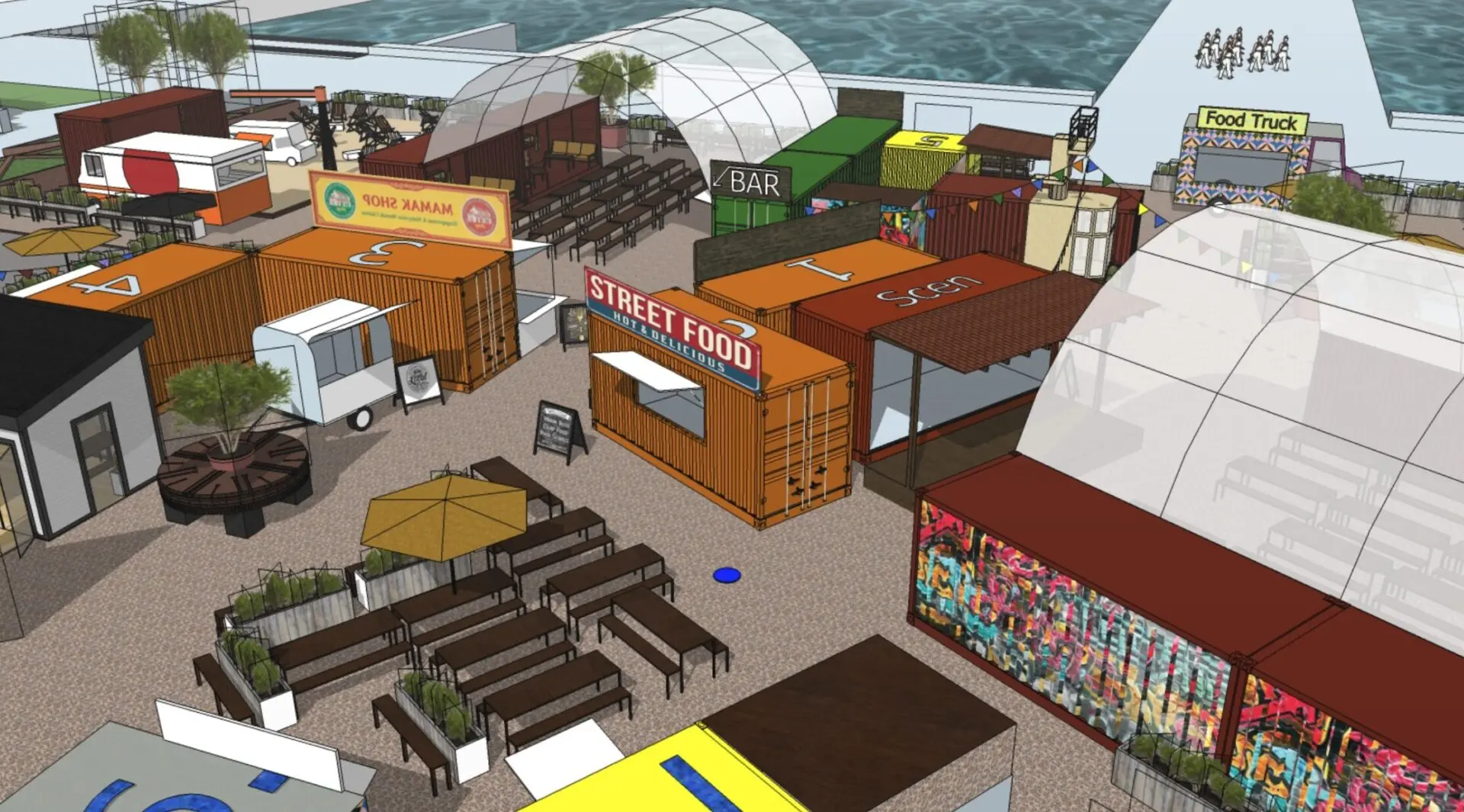 Planen är nu ett attefallshus som komplement till sex fasta containerkök, en permanent foodtruck, två barer, två välvda tak med sittplatser, en scen för mindre uppträdanden och en “mini-strand” med sand och solstolar – allt på den cirka 3 000 kvm stora ytan intill Styrmansbron i Varvsstaden.