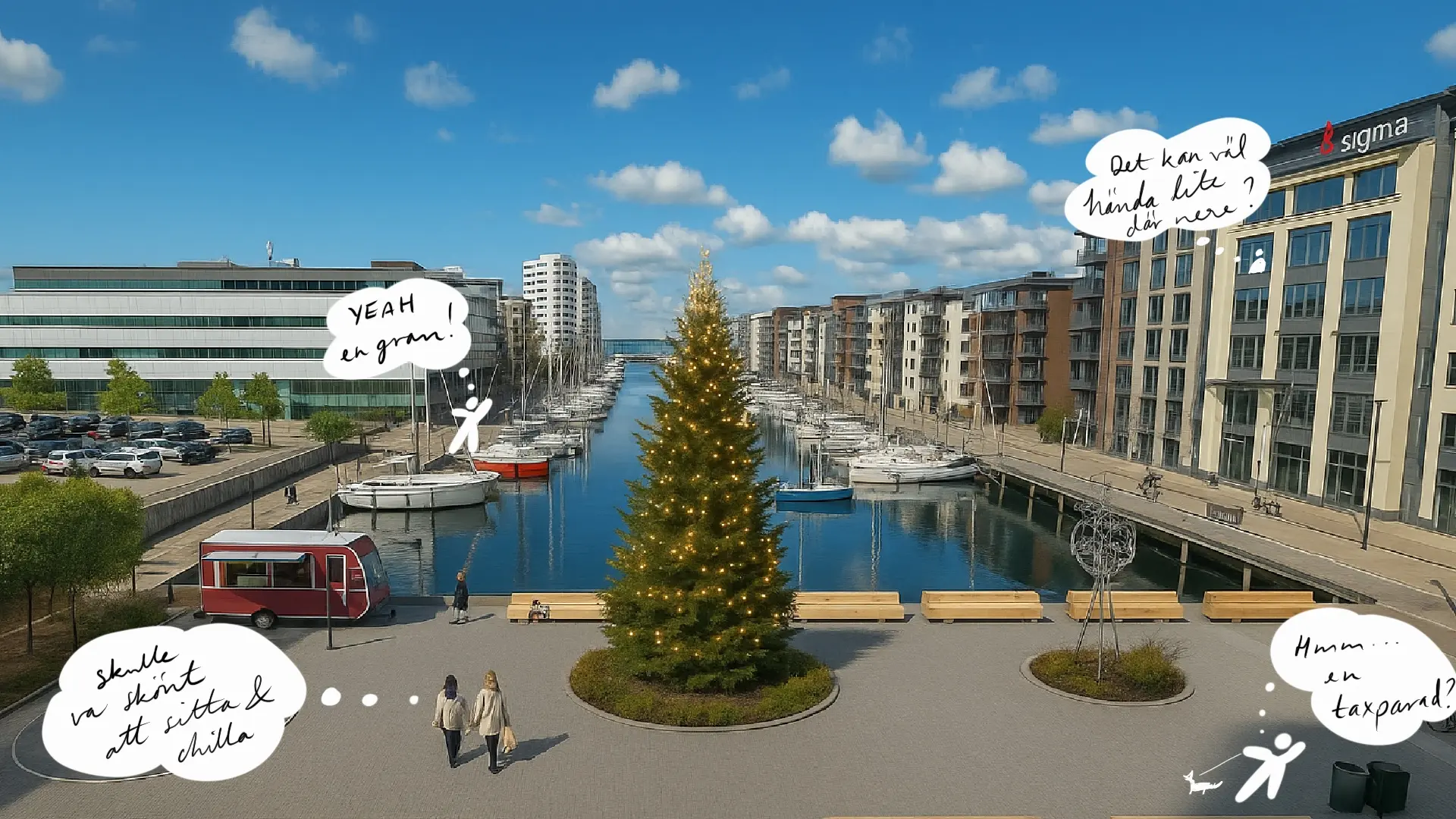 Ett par av de föreslagna aktiveringarna hoppas vi på ska lanseras under vintern. Till exempel en efterlängtad julgran som kommer att stå på Dockplatsen. –> OBS: Uppdatering 03122025. Efter ett par rundor så har vi fått avslag av markupplåtelse på FGK Malmö stad. Vi håller dialogen öppen för att det ska bli ändring 2026.
