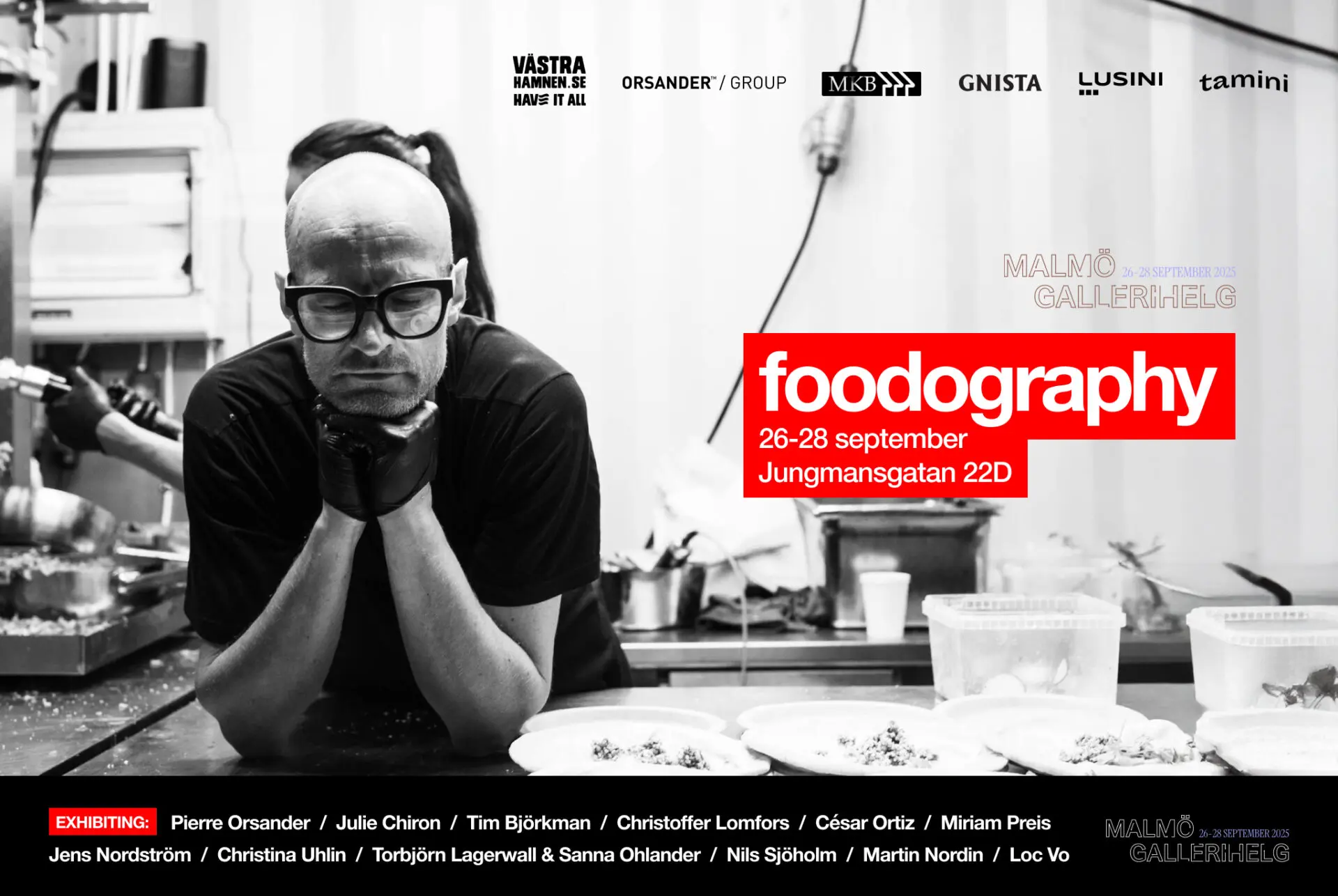 Del av Foodography-utställningen är Pierre Orsander (arrangör och kurator), Jens Nordström, Miriam Preis, Christoffer Lomfors, Christina Uhlin, Sanna Ohlander & Torbjörn Lagerwall, Loc Vo, Tim Björkman, Nils Sjöholm, Julie Chiron, Martin Nordin och César Ortiz.